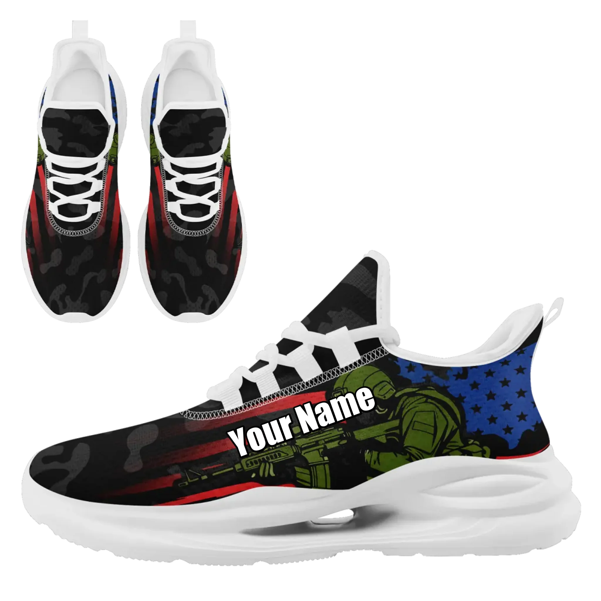 Honor the legacy of American strength and freedom with this powerful athletic sneaker collection. Each pair is a bold tribute to U.S. Veterans and the upcoming 250th Anniversary of our nation (1776-2025). Featuring patriotic eagles, saluting soldier silhouettes, and camo-flag designs, these shoes are for those who stand with pride. Their modern, lightweight design ensures comfort while you're showing your support. Walk with the spirit of those who have defended our liberty for 250 years.